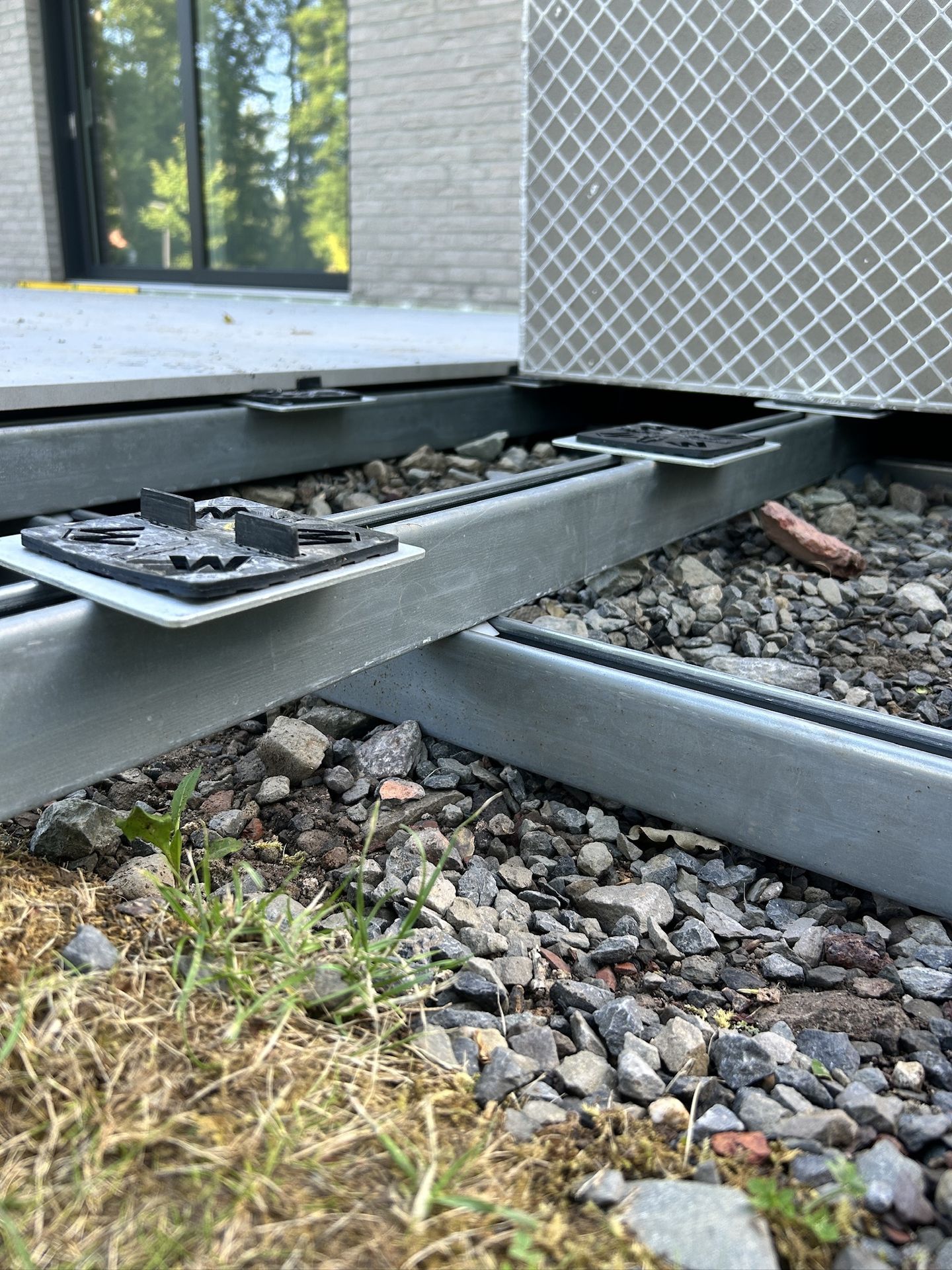 La terrasse Mobiplant repose sur des pieux métalliques vissés dans le sol.