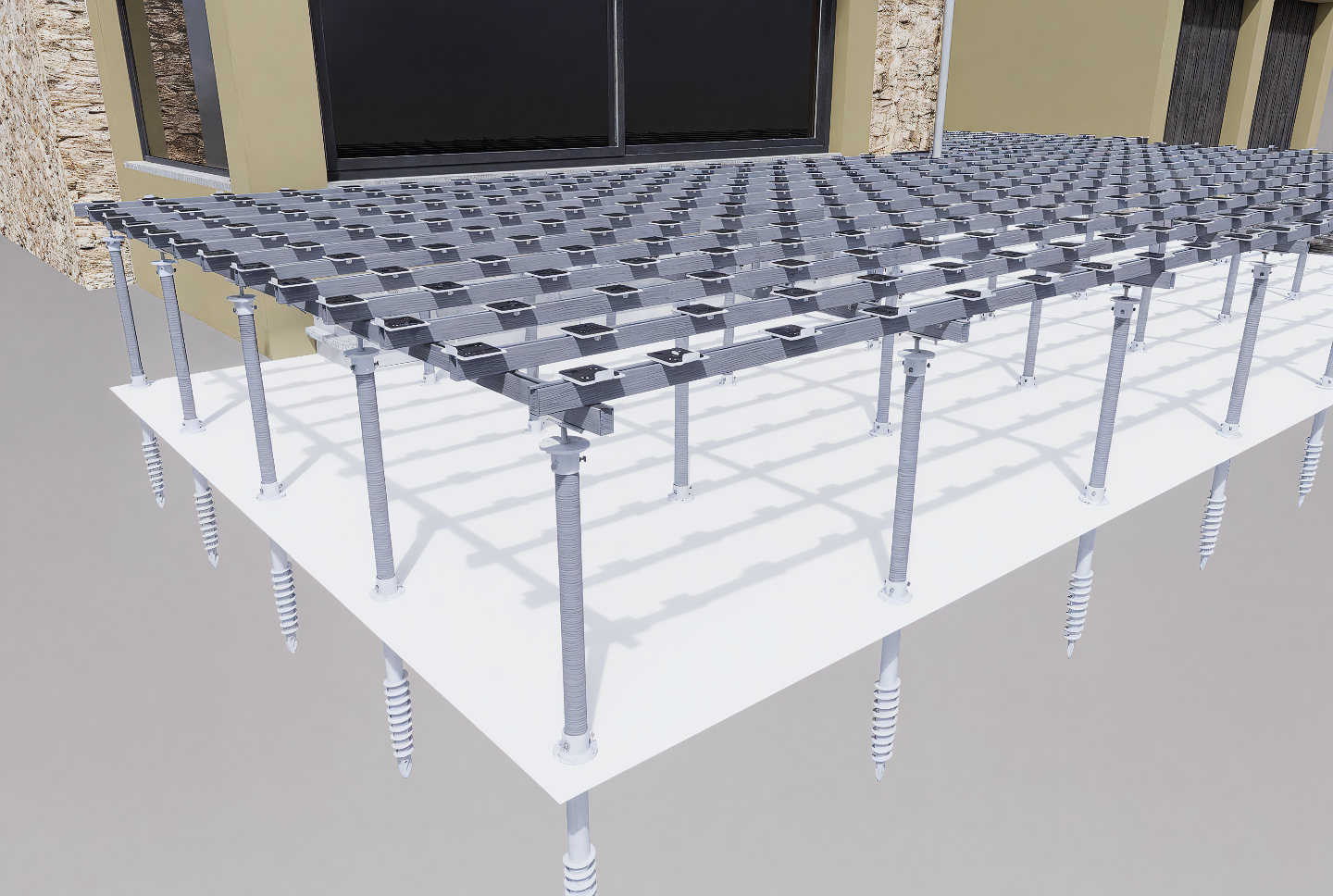 C’est précisément là que notre système excelle : ancrage propre sans terrassement lourd, mise à niveau millimétrée et sol qui reste perméable.